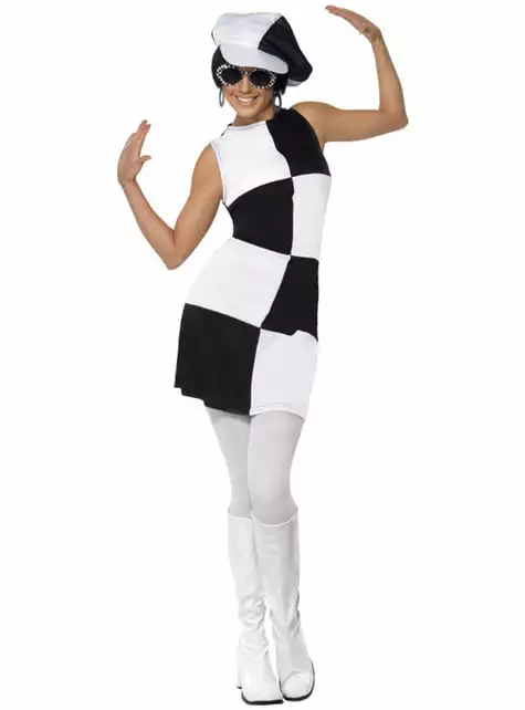 Beinhaltet ein Retrokleid mit weißen und schwarzen Quadraten und eine dazu passende Mütze; ganz im Stil der 60’er.