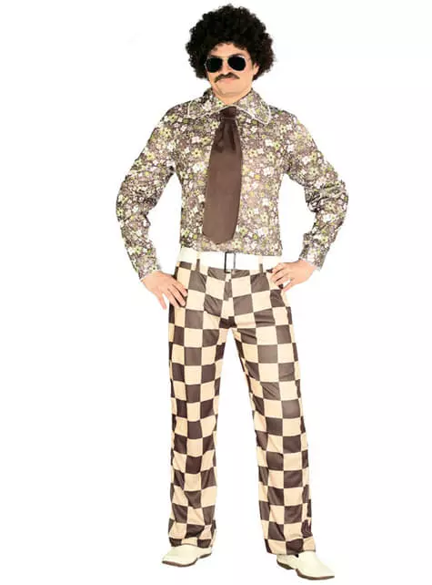 Beinhaltet ein bedrucktes Hemd, einen weißen Gürtel, eine große Krawatte in Braun und eine karierte Hose.