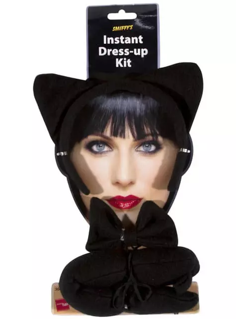 Beinhaltet ein schwarzes Diadem mit Katzenohren, eine Fliege und einen Schwanz.