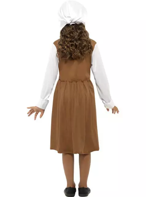 Dieses arbeitsame Kostüm eines Tudor Dienstmädchens besteht aus einem einteiligen Kleid, das einen braunen Rock und ein schwarzes Korsett auf einem weißen Trikot imitiert, einer weißen Schürze und einem passenden Hut.